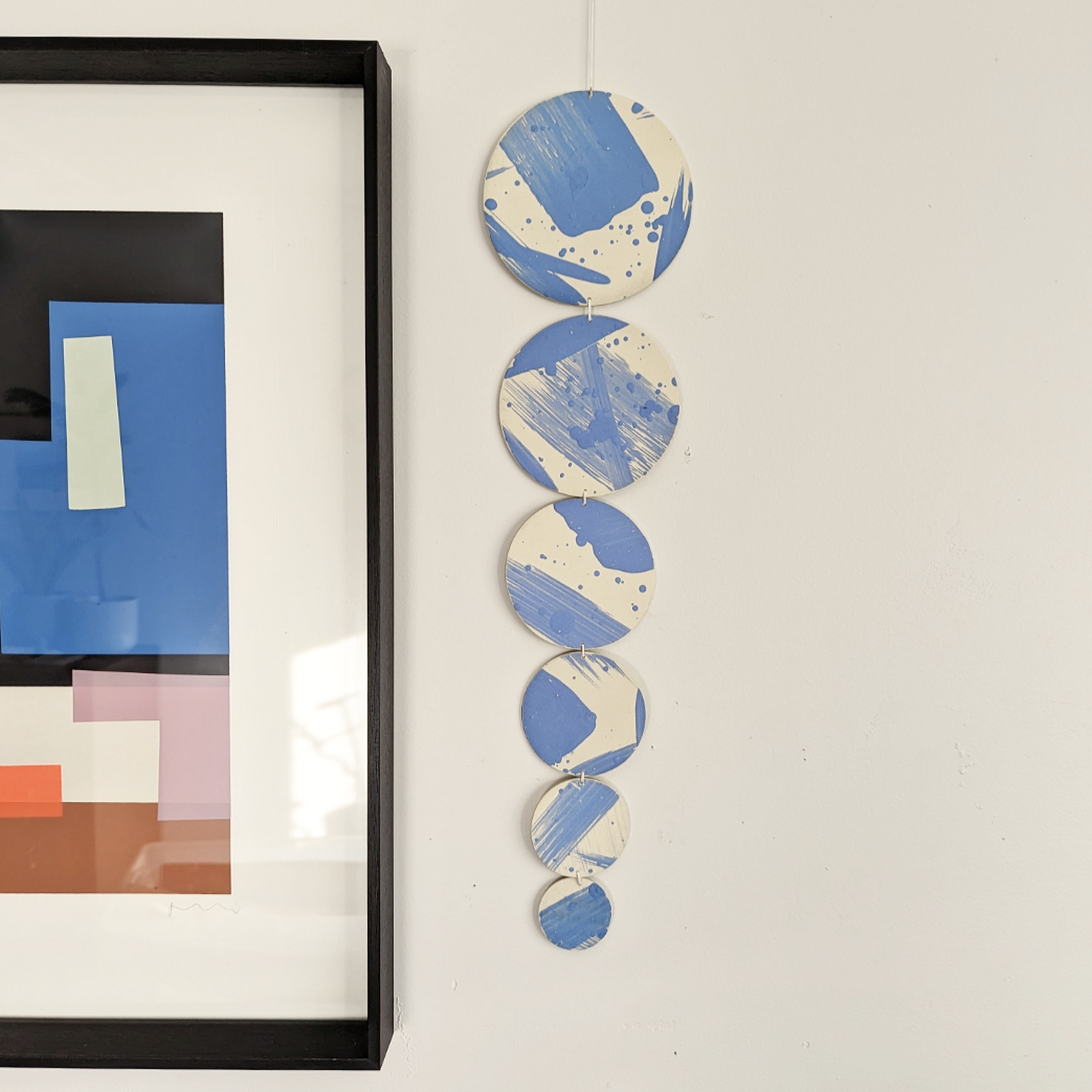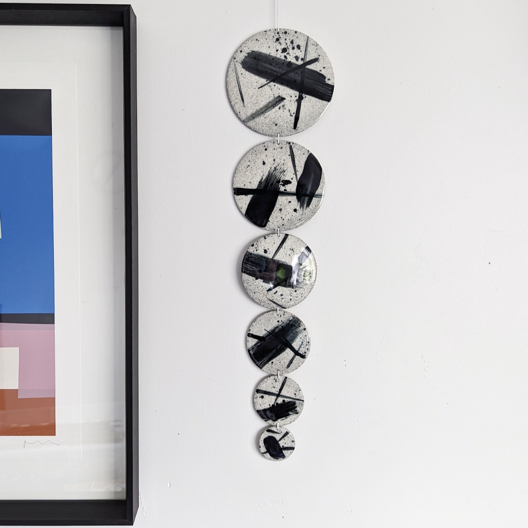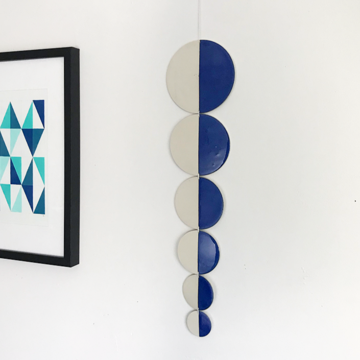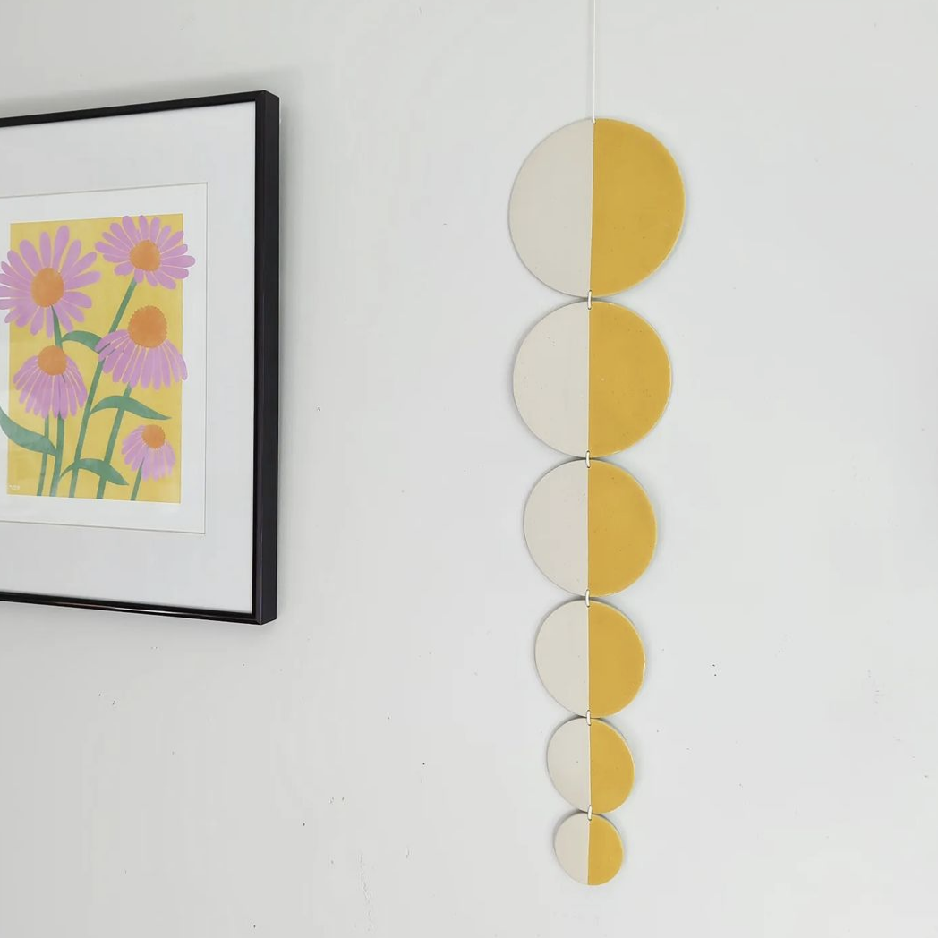 Each wall hanging is handmade from stoneware clay and fired in a kiln twice. The CIRCLES are threaded together with a braided cotton cord and has a minimal cord loop to hang it from the wall.
