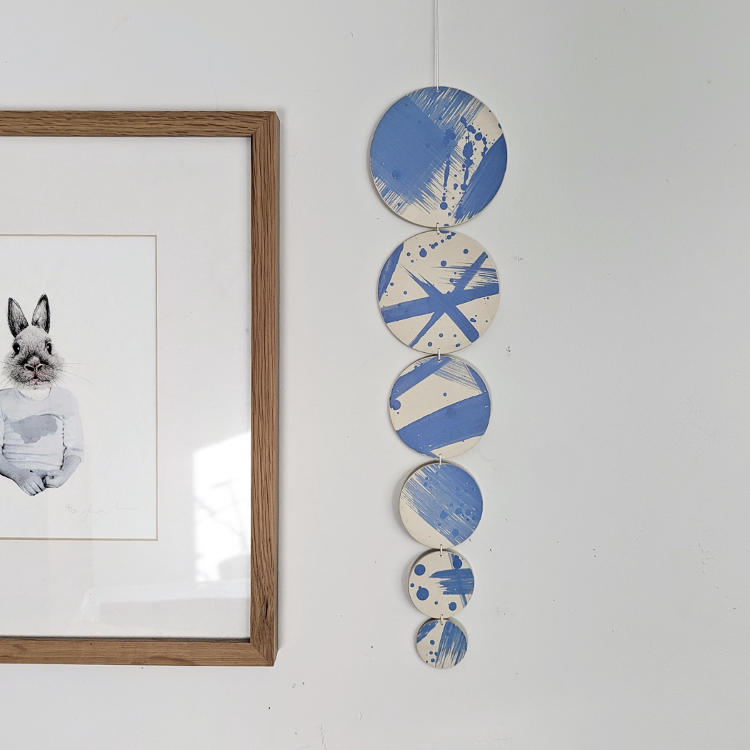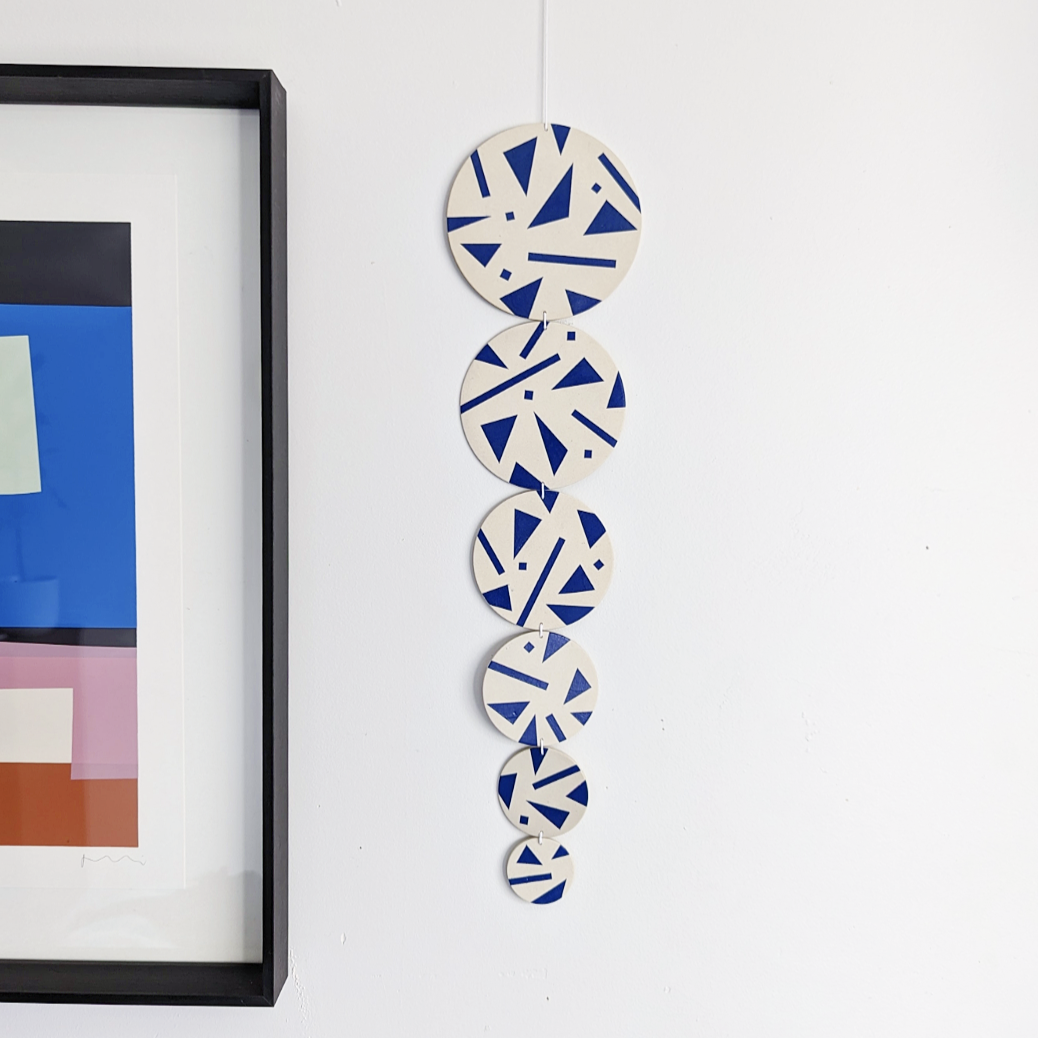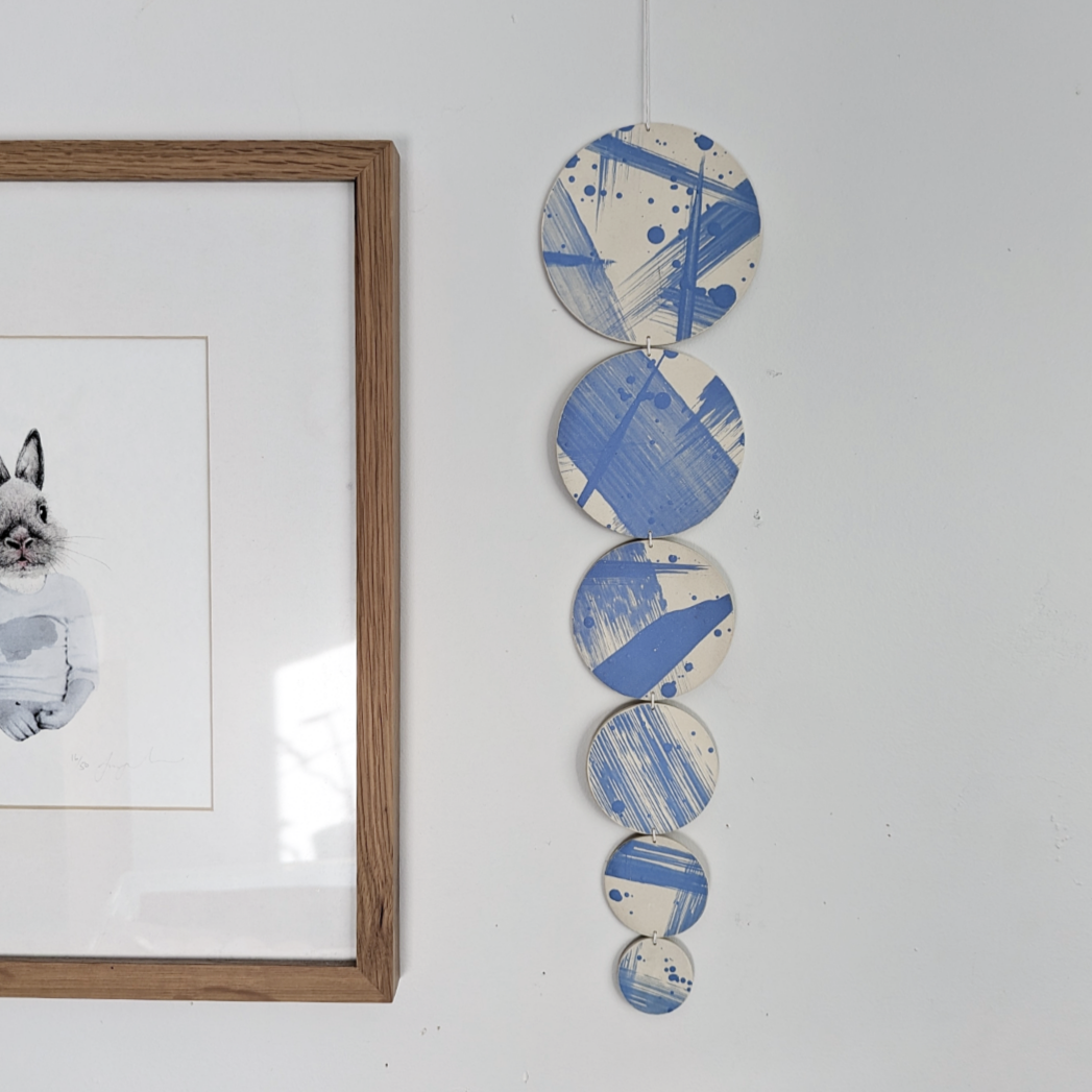 Each wall hanging is handmade from stoneware clay and fired in a kiln twice. The CIRCLES are threaded together with a braided cotton cord and has a minimal cord loop to hang it from the wall.